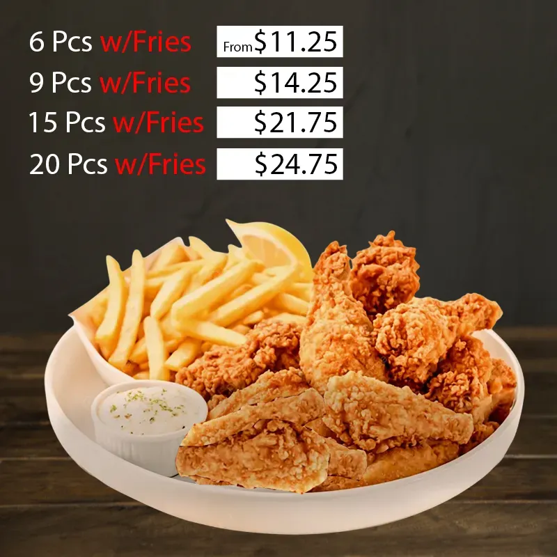 From crispy fried chicken and seafood baskets to rice platters, gyros, burgers, and fresh salads our menu has something for everyone.